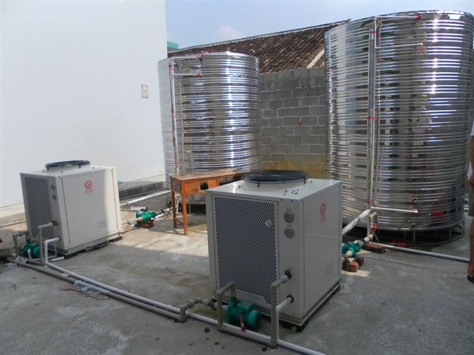 以北京某大學(xué)附屬學(xué)校為例,采用4臺15p循環(huán)熱泵熱水機(jī)組,每日生產(chǎn)180噸熱水,可滿足學(xué)校師生4500人洗浴。機(jī)組采用綠色能源不受資源限制,節(jié)能環(huán)保的熱水供應(yīng)裝置,使用少量的電能驅(qū)動壓縮機(jī)作功,吸取空氣中的熱量,可全天候24小時生產(chǎn)出50℃~60℃的熱水,全年COPh值高達(dá)3.0以上,對比電鍋爐節(jié)省70%電量,并且改造后校園再無煤灰污染,熱水供應(yīng)穩(wěn)定,使用和維護(hù)綜合費(fèi)用節(jié)省30%以上。