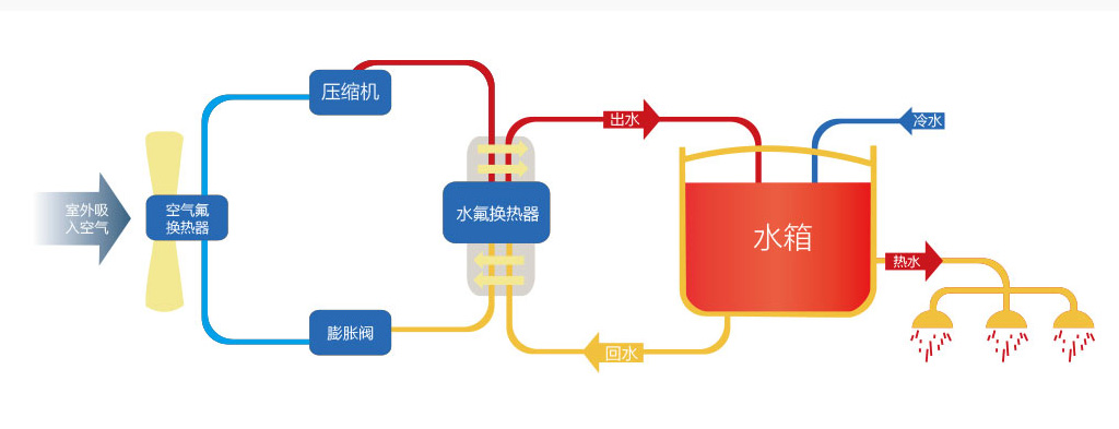 循環(huán)式熱泵機(jī)組啟動(dòng)后,冷水進(jìn)入機(jī)組與冷媒交換熱量時(shí),不會(huì)立即升溫到設(shè)定的出水溫度,而是稍微升溫(一般循環(huán)一次升溫5~10°C)后先進(jìn)入水箱將水加滿,再將水箱中的水不斷經(jīng)過(guò)熱泵機(jī)組循環(huán)升溫,直至水箱內(nèi)的水達(dá)到設(shè)定的出水溫度為止。