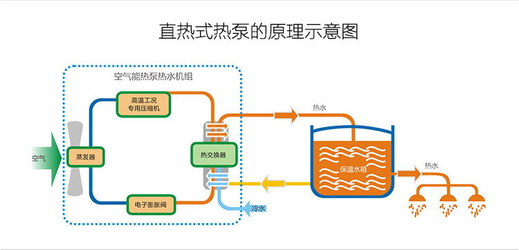 在工程設(shè)計(jì)上,循環(huán)式熱泵在工程設(shè)計(jì)中有兩種循環(huán)加熱方式,一種是熱泵機(jī)組直接和熱水箱相連,直接循環(huán)加熱,好處是工程簡(jiǎn)單、造價(jià)低,缺點(diǎn)是循環(huán)加熱過(guò)程中不能使用熱水(水溫未達(dá)到,系統(tǒng)自動(dòng)停止供水),比較適合定時(shí)供應(yīng)熱水的場(chǎng)景。