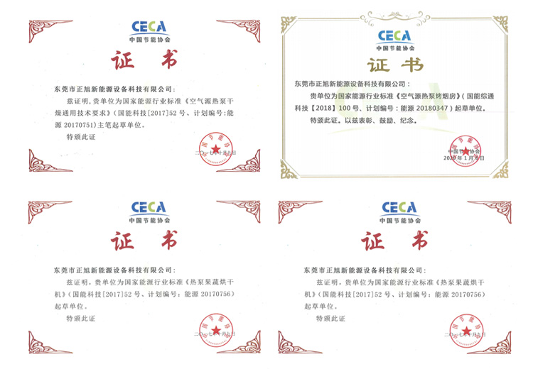 憑借著卓越的技術優勢,正旭不僅參與國家標準《金銀花空氣源熱泵干燥通用技術要求》起草制定,還是國家能源行業標準《空氣源熱泵干燥機組通用技術規范》主筆起草單位,參與《空氣源熱泵烤煙烤房》、《空氣源熱泵果蔬烘干機》、《空氣源熱泵糧食干燥機》、《空氣源熱泵烤煙房煙葉調制技術規程》、《空氣源熱泵中藥材烘干技術通則》、《空氣源熱泵污泥干化機》等十多項標準已頒布實施,擁有多項重量級發明專利,連年榮獲《中國熱泵行業十大優秀工農業烘干品牌》稱號,并進入全國多省市地區農機購置補貼目錄。正旭積極參與鄉村振興,提升農產品烘干技術,共同助力碳達峰、碳中和,實現“雙碳”目標!